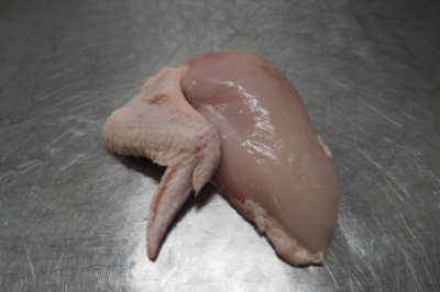 Este producto contiene dos partes unidas en una misma pieza, la pechuga y el ala. Se vende fresco y en la cantidad deseada por el cliente. En este caso, la pechuga se vende sin la piel.